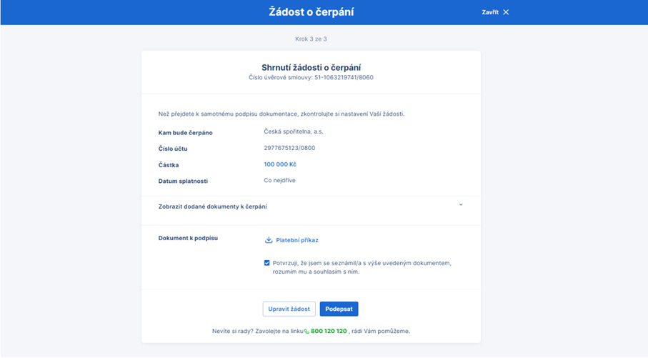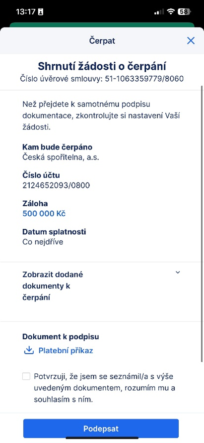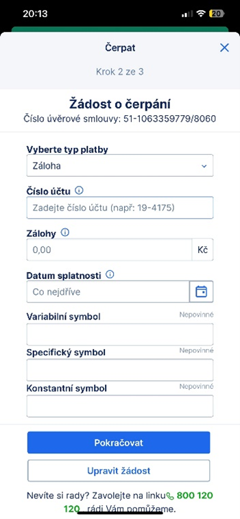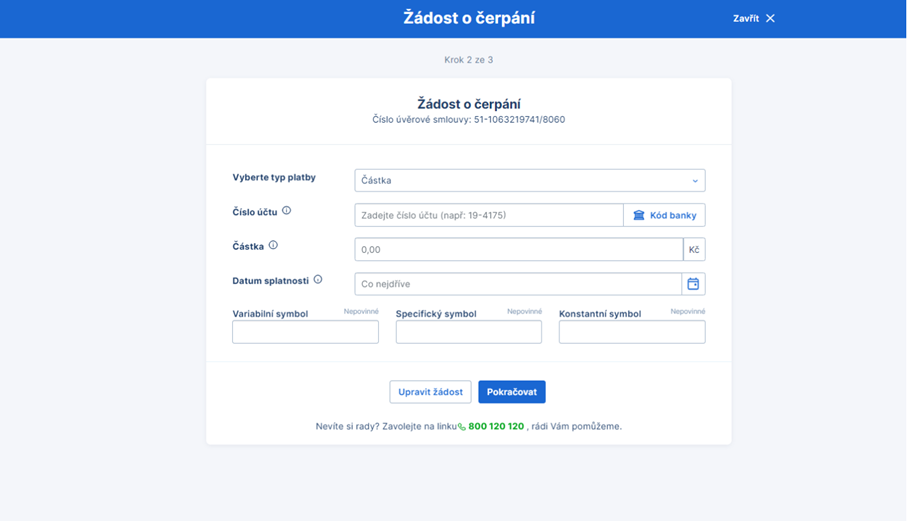Jde o číslo účtu, částku, kterou si přejete čerpat, datum splatnosti a další detaily.