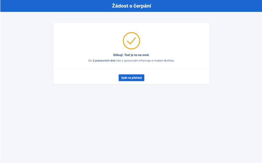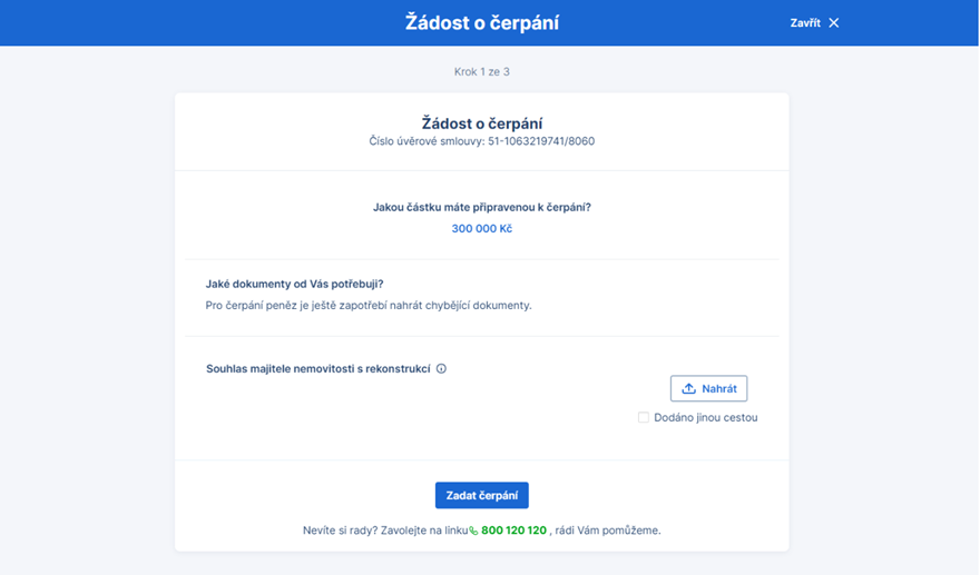 Uvidíte zde přehled chybějících dokumentů, které je třeba nahrát pro čerpání peněz. Můžete také označit, že jste dokumenty dodali jinou cestou.